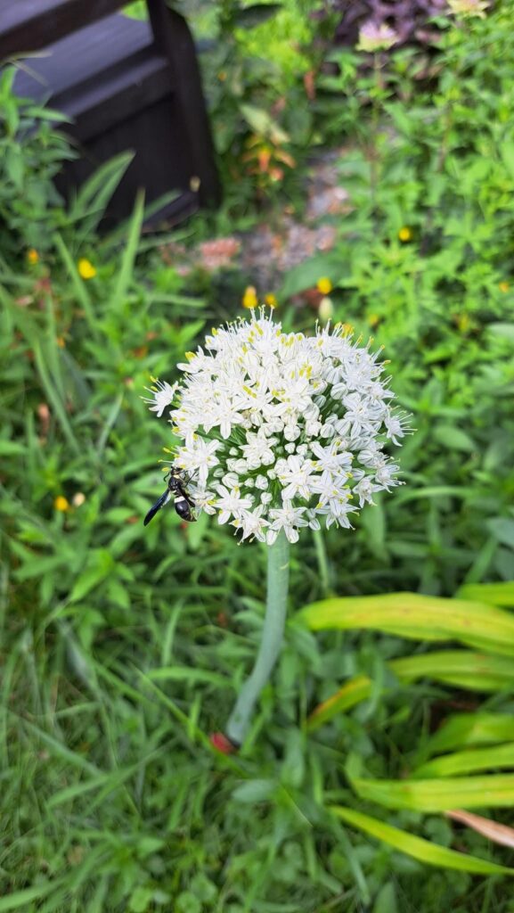 Just for fun – ordinary produce from the grocery store will grow a flower. Most garden vegetables are bienuals, they are harvested before they flower. The below picture is an allium flower grown from a regular white onion rooted in some water than planted in my flower garden in the spring.